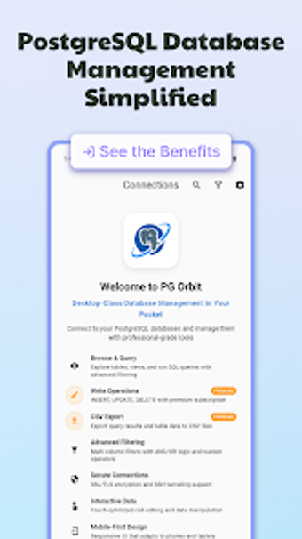PG Orbit erbjuder både gratis och premiumfunktioner. Premiumversionen möjliggör skrivoperationer och avancerade frågor, samt export av CSV-filer. Appen prioriterar säkerhet med biometrisk skydd och krypterad lagring av användardata. Den är perfekt för databasadministratörer, utvecklare och dataanalytiker som behöver tillgång till sina databaser på ett säkert och effektivt sätt, oavsett var de befinner sig.